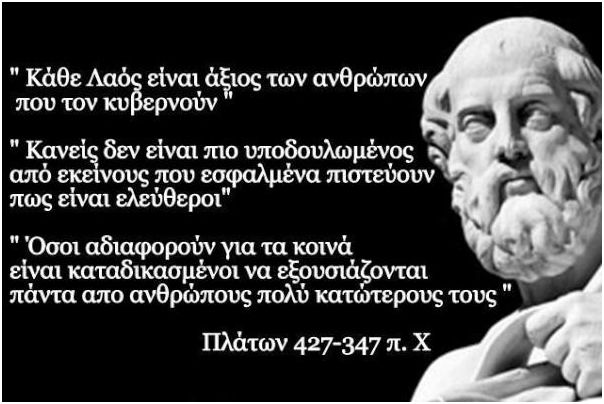 Ακολουθώντας τον ΣΩΚΡΑΤΗ, ο ΠΛΑΤΩΝΑΣ πίστευε ότι «η γνώση είναι αρετή, η γνώση του φιλοσόφου, που έχει κατακτηθεί με προσπάθεια είναι αυτό που δικαιώνει την καταλληλότητα του να κυβερνήσει. Η ικανότητά του να ρυθμίζει τα πράγματα με τον πιο πλεονεκτικό τρόπο δείχνει ότι η αρχή του πολιτεύματος πρέπει να είναι η αρχή της πεφωτισμένης δεσποτείας. Μετά την παραίτηση του πρωθυπουργού, ο Πρόεδρος της Δημοκρατίας ανέθεσε την εντολή σχηματισμού κυβέρνησης σε ΄Ελληνα Φιλόσοφο, με διεθνές κύρος. Μετά την ψήφο εμπιστοσύνης που πήρε, μέσα σε μία εβδομάδα έφερε τα πάνω κάτω στην Ελλάδα.
